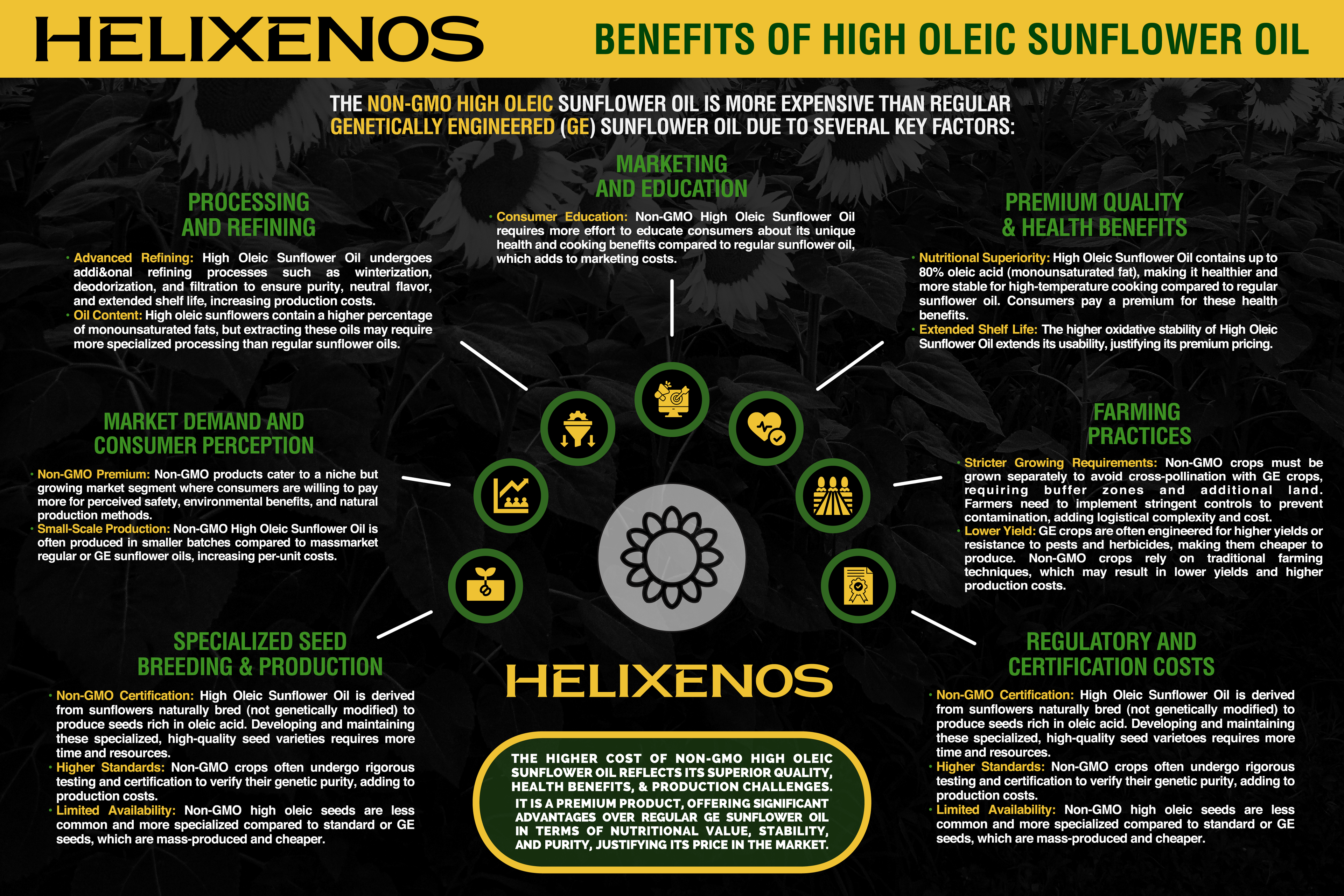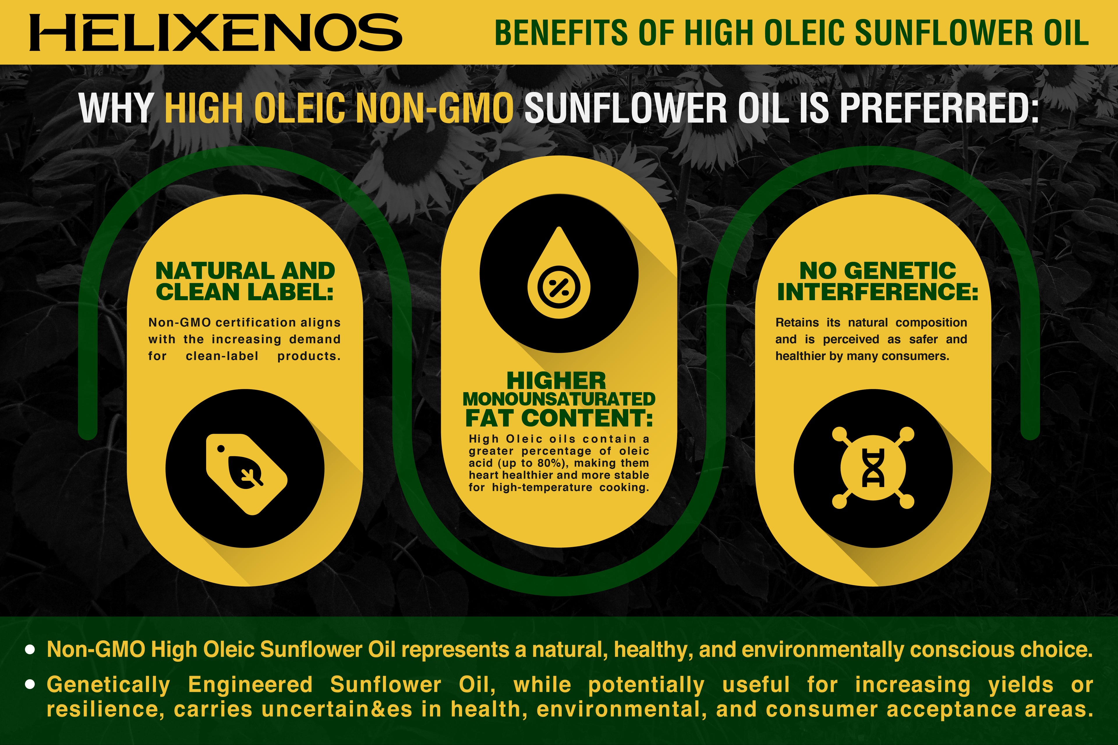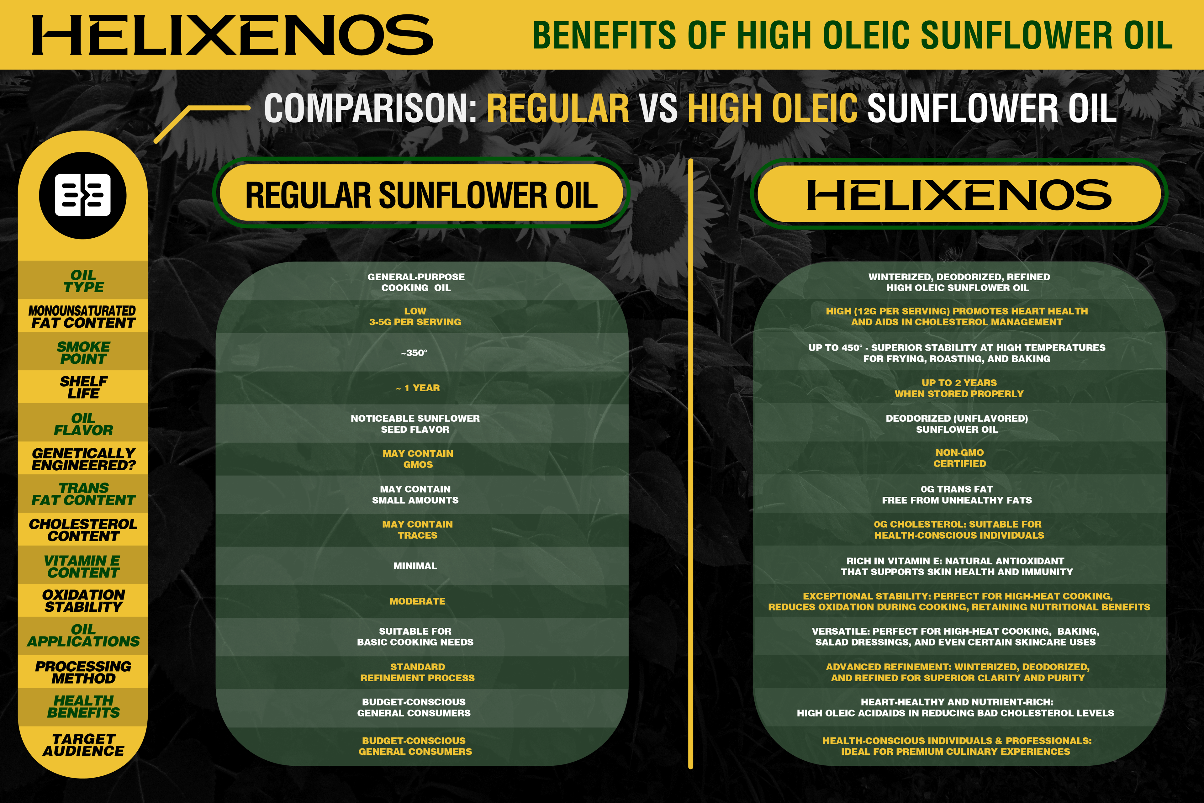 HELIXENOS High Oleic Sunflower Oil contains 75–85% monounsaturated fats, which are known to support cardiovascular health and reduce bad cholesterol.